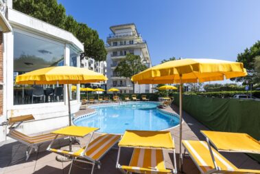 La terrazza bar dell’Hotel La Siesta a Jesolo accoglie gli ospiti dalle prime ore del mattino per la colazione fino alla sera, offrendo un luogo versatile per iniziare la giornata con una colazione all’aperto e concluderla con drink raffinati in un’atmosfera accogliente e suggestiva. Con arredi moderni e un servizio attento, è il luogo perfetto per trascorrere piacevoli serate estive in un ambiente invitante. - La piscina